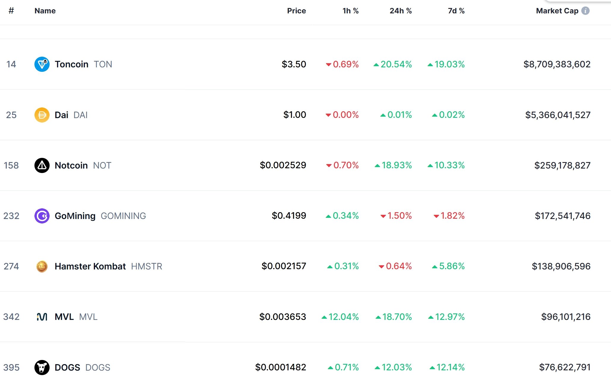 随著 Pavel Durov 获准离境的消息传出,Coinmarketcap 数据 显示,或受此消息激励,TON 生态部分代币大涨,其中: