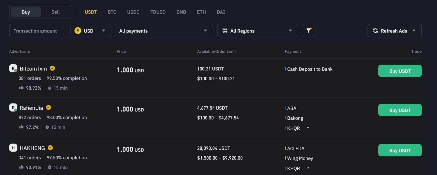 Binance 是最适合定制的 P2P 加密货币交易所之一。特别是如果您是有特定要求的买家。例如,初始搜索需要首选货币、支付类型和国家。买家可以选择比特币、以太坊、BNB、Dai、USDC、FDUSD 和 USDT;每种货币都有充足的流动性。