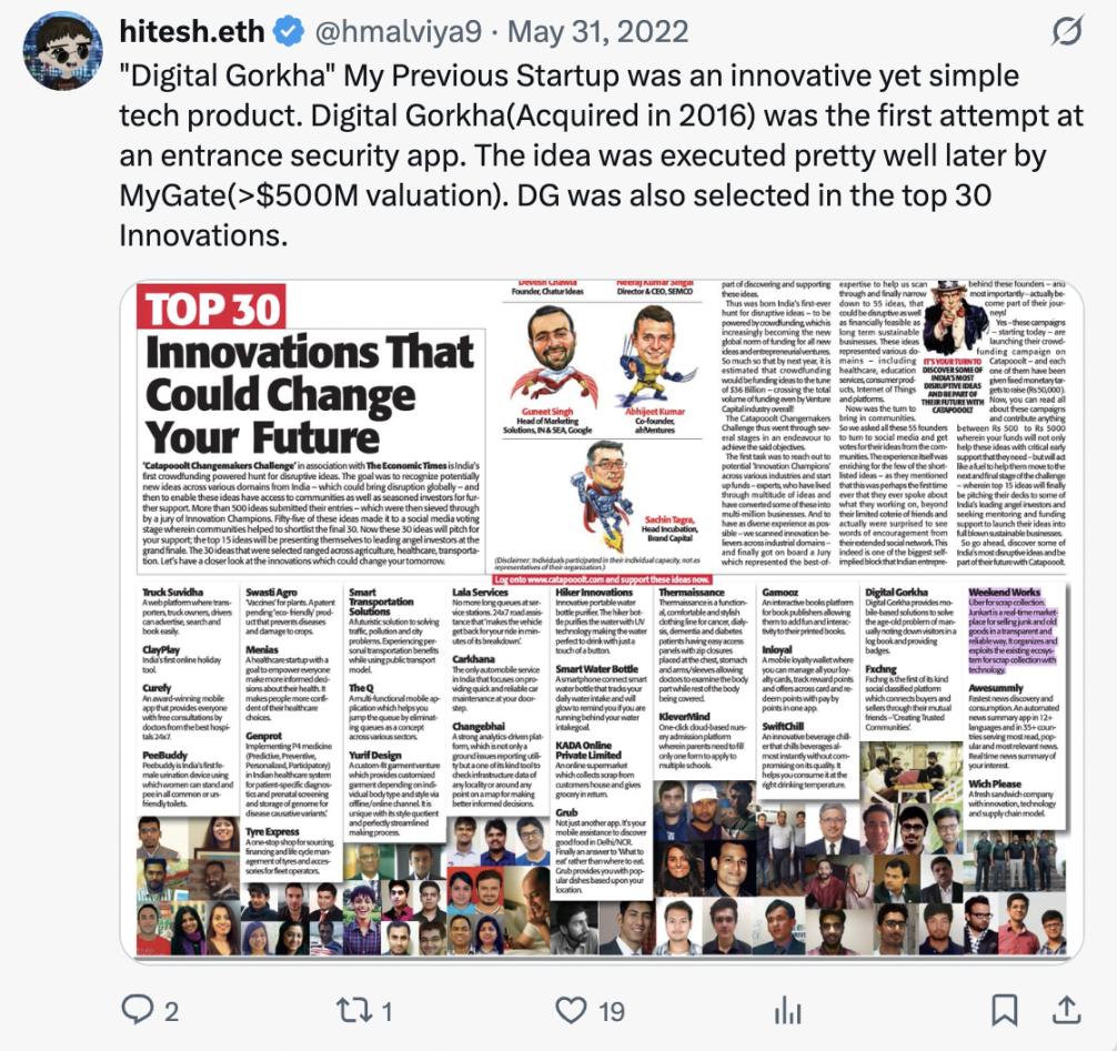 推文内容:「Digital Gorkha」 是我之前的创业项目,它是一款颇具创新性却又简单直接的科技产品。Digital Gorkha(于 2016 年被收购)是开发门禁安保应用程序的首次尝试。后来 MyGate 公司(估值超 5 亿美元)将这个创意执行得非常出色。