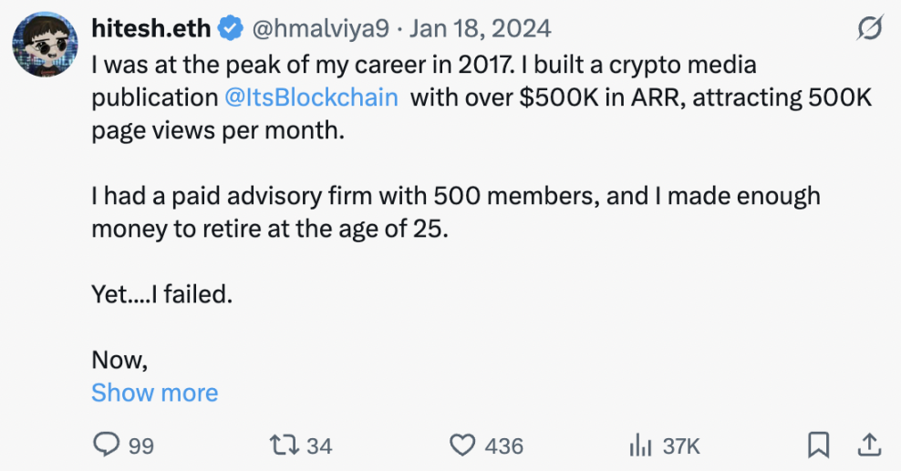 推文内容:2017 年是我职业生涯的巅峰期。我创办了一家加密媒体出版物Its Blockchain ,年经常性收入(ARR)超过 50 万美元,每月吸引 50 万页面浏览量。我还拥有一家有 500 名会员的付费咨询公司,赚的钱足够让我在 25 岁就退休了。