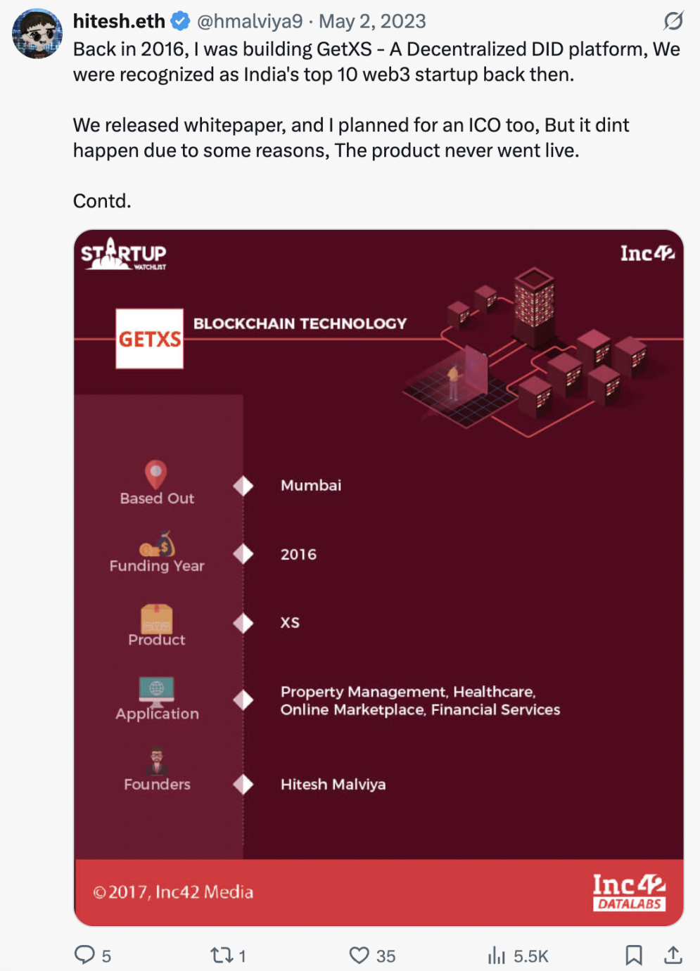 推文内容:「回到 2016 年,我正在打造 GetXS—— 一个去中心化的分布式身份识别(DID)平台,当时我们被评为印度排名前十的 Web3 创业公司。我们发布了白皮书,还计划进行首次代币发行(ICO),但由于一些原因未能如愿,产品也从未上线。