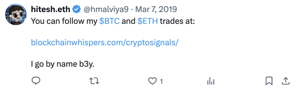 推文内容:你可以在这个网址关注我的比特币和以太坊交易,我的昵称是 b3y。
