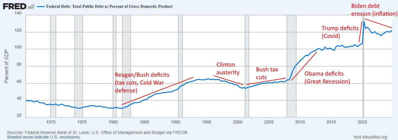 这显然是非常不明智。2021-2022年,我对债务问题关注不足,原因有三:A) 通胀正在侵蚀债务价值 B) 我预期利率会下降 C) 我认为疫情救济支出结束后政府赤字将得到控制。最令人担忧的是,民主党的财政政策核心理念已发生重大转变:他们从主张加税的政党,变成了推行无资金来源支出计划的政党。后来,我才开始意识到问题的严重性,并开始呼吁政府实施财政紧缩政策。