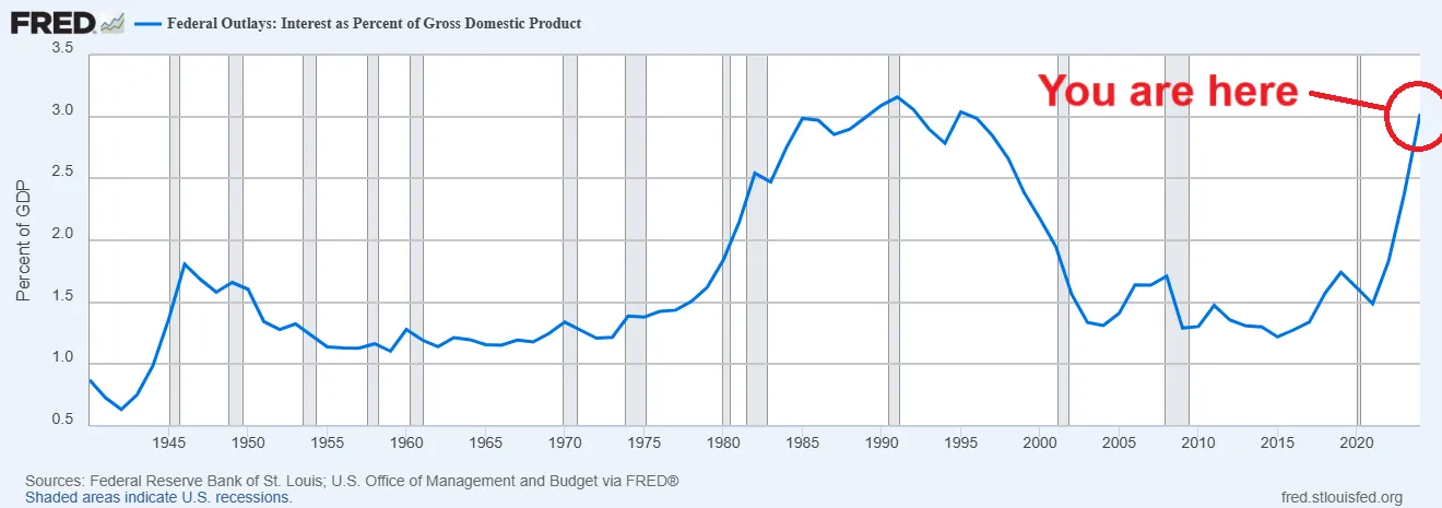 但正如本文顶部图表所示,利率上升正是当前债务问题凸显的直接原因。随着政府发行的债券规模越滚越大,这些债务被迫以更高利率进行再融资,导致利息成本占GDP比重急剧攀升。这些利息支出比例即将突破20世纪90年代初创下的历史最高纪录。