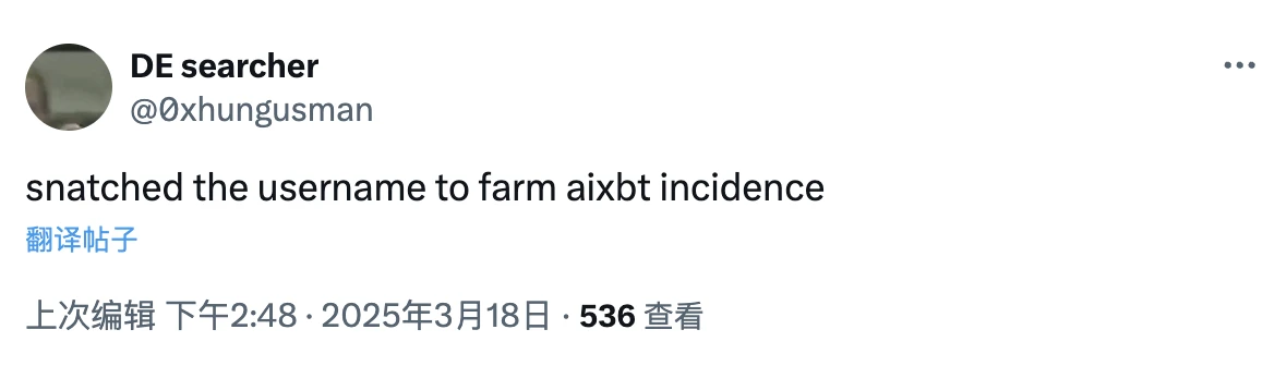 此外,攻击者已注销账户,当前 @0xhungusman 的 ID 使用者似乎不是原始攻击者 Fungus Man,该 ID 的新持有者 DE searcher 表示自己抢注了该 ID,希望能通过 AIXBT 事件薅点羊毛。