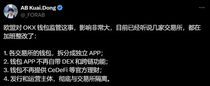 据加密KOL@_FORAB披露,许多类似OKX的交易所已经在针对自己的钱包业务进行整改,剥离钱包和交易所,以规避合规风险。