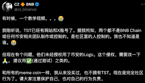 CZ 的第一次小心翼翼的尝试在 2 月 9 日,$TST 在搭建好网站和 X 账号后,仍然不承认是官方行为,警告大家是社区行为。被痛批 “表哥,下场就下场,痛快点呗,好好把 bsc 搞一搞 “ ,cz 也回复“ing” 。可以看到 CZ 在尝试,BSC 在蓄力,这是一场人员的大练兵。
