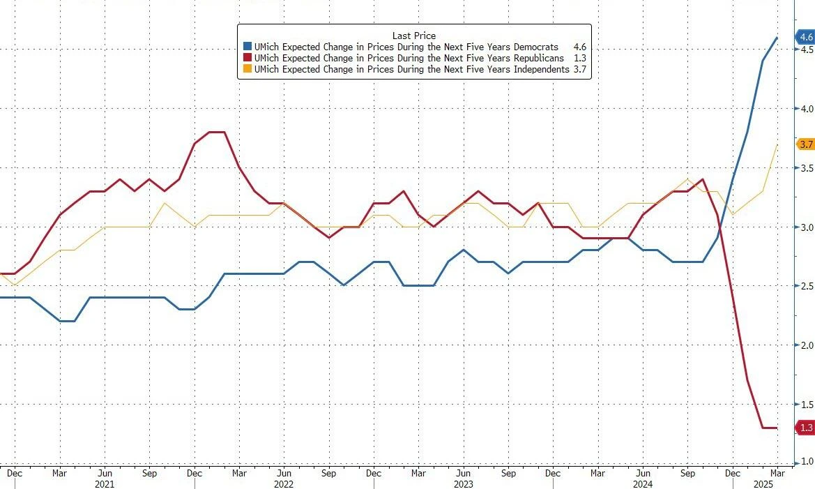 周五公布的密歇根大学消费者信心指数和一年期通胀预期则给出了与现实数据相反的方向,一年期、五年至十年期通胀预期初值(+ 3.9% ,预期 3.4% )继续飙升,然而数据延续了此前的党派分化情况,按照党派划分的预期有着迥异的差异,通胀预期的飙升主要来源于民主党人士。事实上,这种党派数据的明显差异,让这个数据变成了市场噪音。