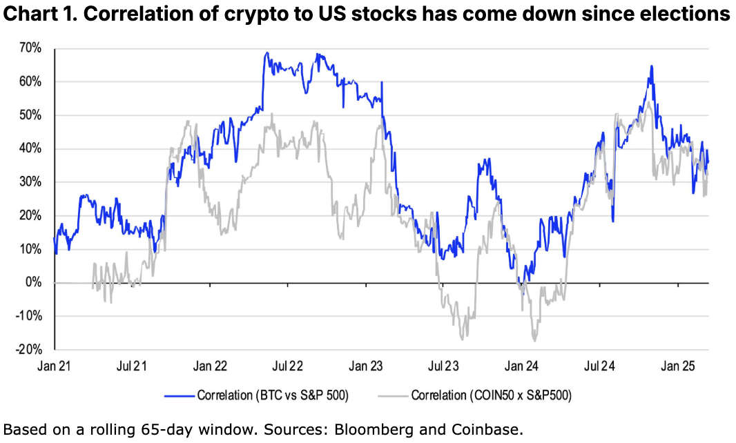尽管监管方面的消息传来利好,但许多市场玩家担忧加密领域特有的催化剂效应减弱。这导致宏观因素成为主导力量,加密市场与美股的关联性在上升。事实确实如此,传统风险资产与加密市场的近期走势相关性已清晰表明,我们此前对2025年第一季度的乐观预期显然出现了误判。