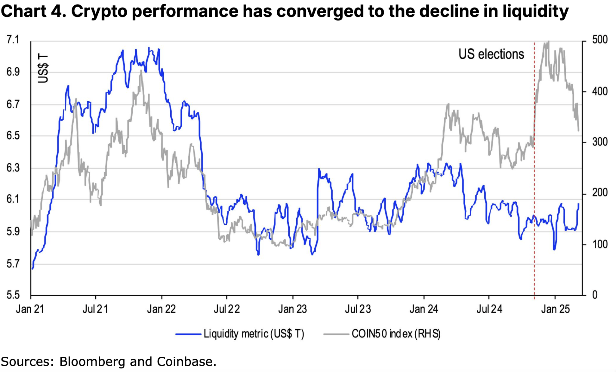 另外,我们并不认为加密货币近几周的疲软表现与当今宏观紧缩条件存在异常背离。相反,真正的背离体现在2024年11月(美国大选)至2025年1月20日(总统就职)期间加密资产与传统风险资产的表现差异。尽管2024年下半年起流动性环境已逐步趋紧,但此期间以COIN50指数为代表的市场价格却累计攀升逾67%(详见图表3)。