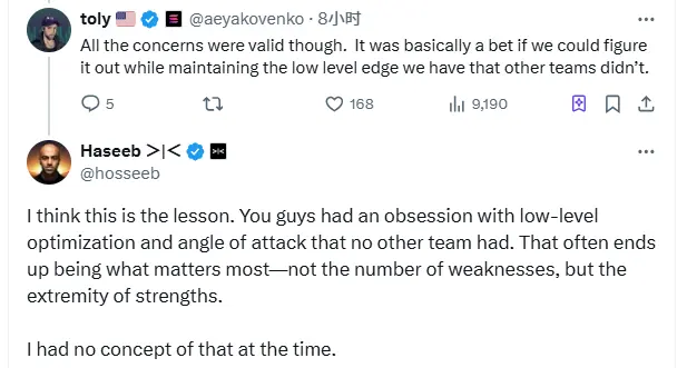 而后 Haseeb 回复 Toly:“我想这就是其中的教训。你们对底层优化和独特攻击角度的执着,是其他团队所不具备的。这种发挥到极致的的扬长避短才是最重要的。当时的我完全没有意识到这一点。”