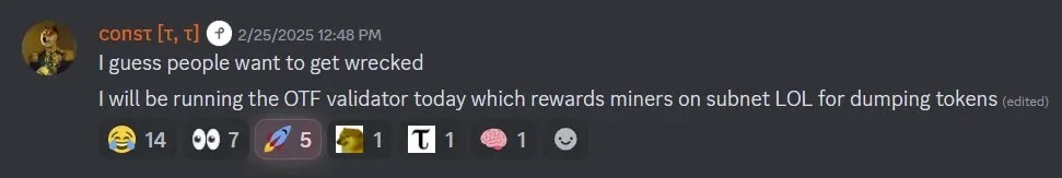 就在升级前,一位匿名人士接管了子网 281 ,并将其变成了一个名为“TAO Accumulation Corporation”(简称“LOL 子网”)的模因币子网。这显然与 AI 毫无关系。