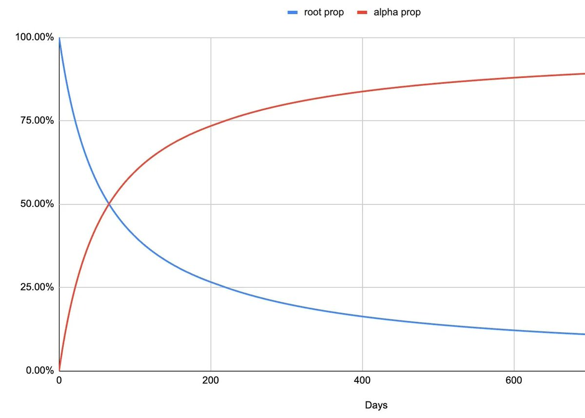 在这个过渡期,控制排放的权力将从旧机制(SN 0 或“root 属性”)转移到新的 dTAO 机制(“alpha 属性”)