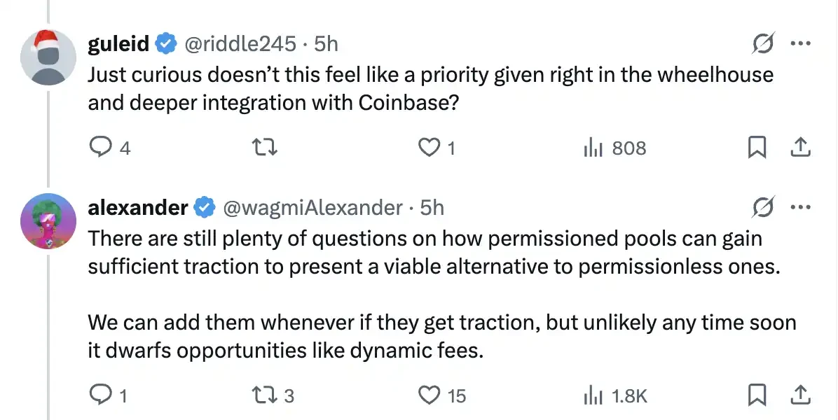 他在回复别人的推文中写道,「关于许可池(permissioned pools)如何能够获得足够的吸引力,从而成为无许可池(permissionless pools)的可行替代方案,这仍然有很多疑问。如果它真的获得了市场认可,我们随时可以加入支持。但短期内来看,它不太可能超过动态费率(dynamic fees)这样的机会。」
