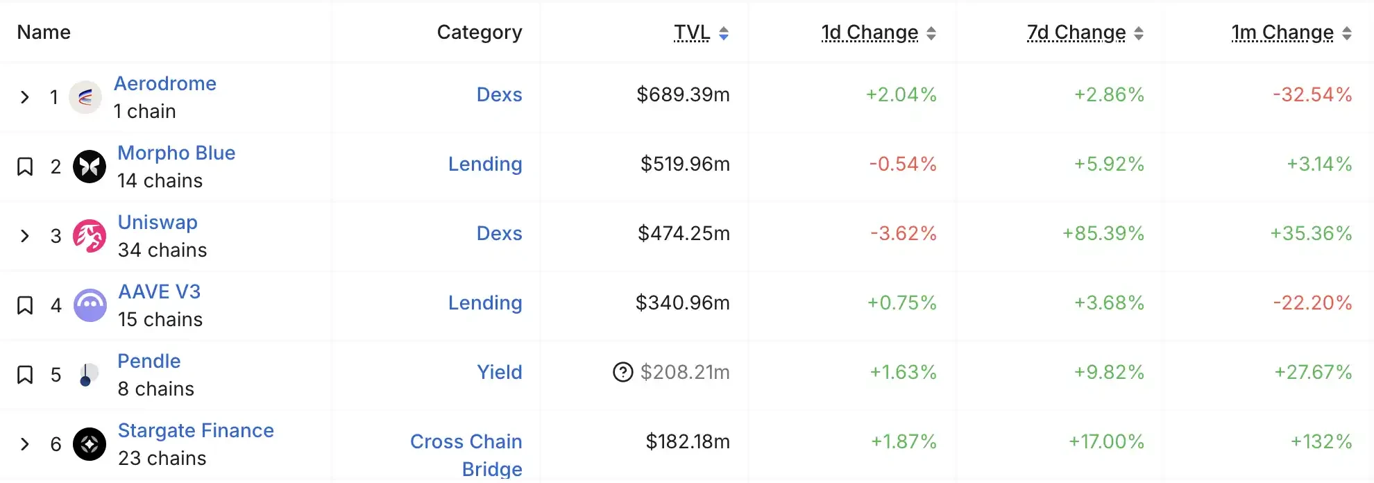 Aerodrome 在 Base 上的 TVL 排名第一;图源:DeFiLlama