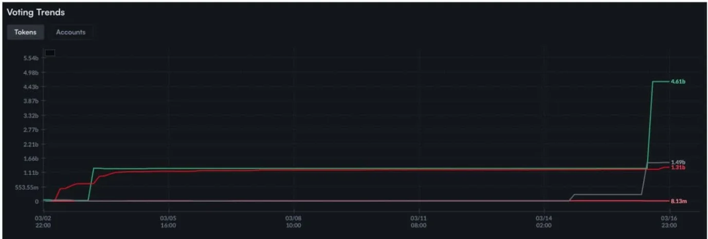 所以 Cronos 干脆演都不演了 —— 最后一刻约 33.5 亿 CRO 直接入场投下了赞成票。这也是为什么上图中最后绿线会突然抬头。