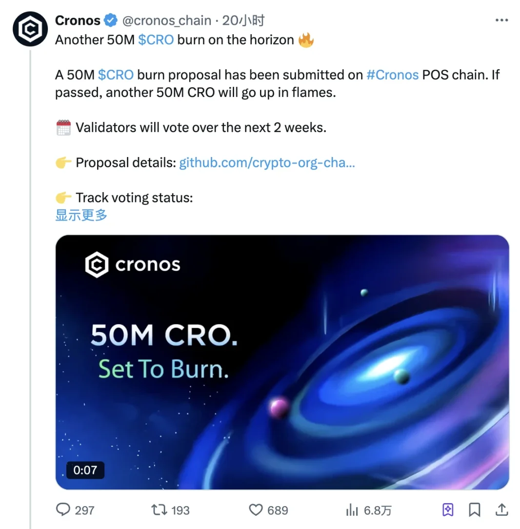 上述提案通过后,Cronos 于 X 高调宣发了另一项提案,提议销毁 5000 万 CRO —— 足足占 700 亿的 0.07% ,这才叫真正的侮辱!