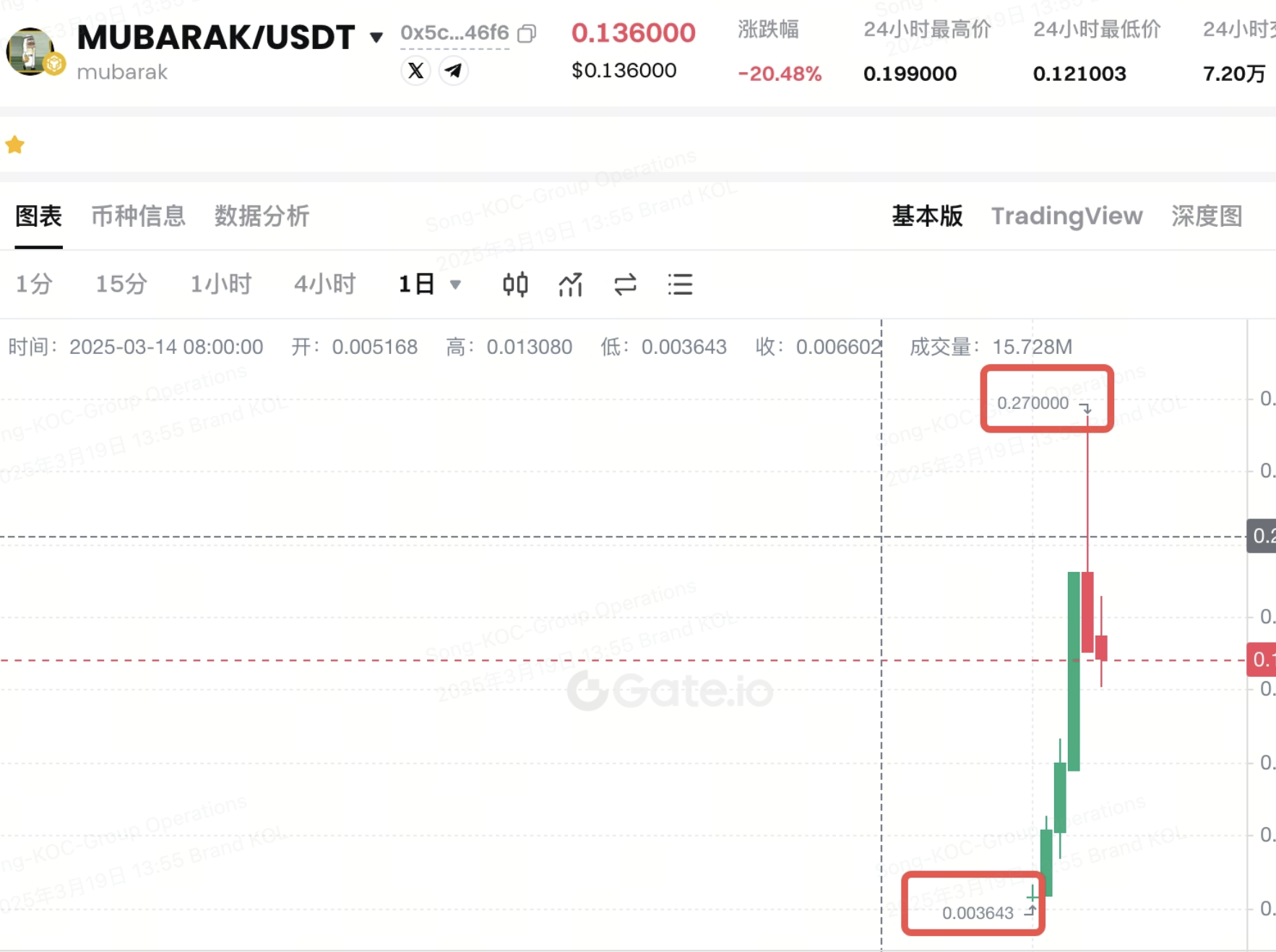 - 创新区首发 :2025年3月14日11:40(UTC+8),MUBARAK在Gate.io创新区全球首发上线,最高涨幅达7400%。