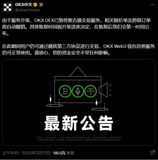 3月17日,OKX突发公告,表示在与监管机构协商后主动决定暂时暂停 DEX 聚合器服务,以便进行更多安全升级,防止进一步滥用。受此影响,相关的限价单及跨链订单将自动撤销。OKX 表示具体恢复时间将视升级进度而定,在此期间,用户仍可通过跳转至第三方协议进行交易,OKX Web3钱包的其他服务则不受影响。