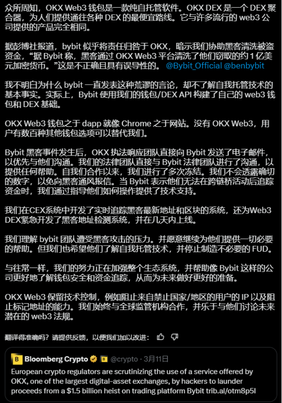 要论及原因,还要回到彭博社的一篇报道。3月11日,彭博社对Bybit黑客事件进行了报道,其中提到“欧洲加密货币监管机构正在审查加密交易所OKX提供的一项服务的使用情况,原因是Bybit方表示黑客已利用OKX Web3平台清洗了从 Bybit 窃取部分赃款,金额达 1 亿美元。”