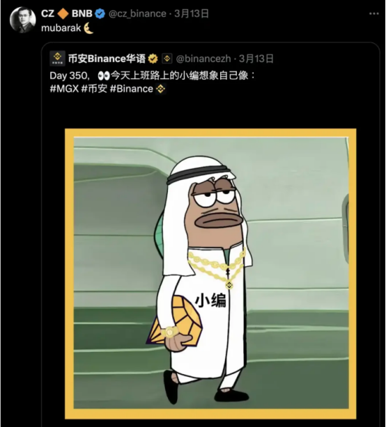 CZ终于掌握了MEME的玩法,在融资消息宣布的第二天下午 2:38,币安华语官方号在社媒发布了一张小编身穿阿拉伯服饰的MEME图,随后,CZ转发了该推文,并配文“Mubarak”。MEME市场马上闻风而至,一时间,Four.meme发射了数十个以Mubarak为Ticker的代币。