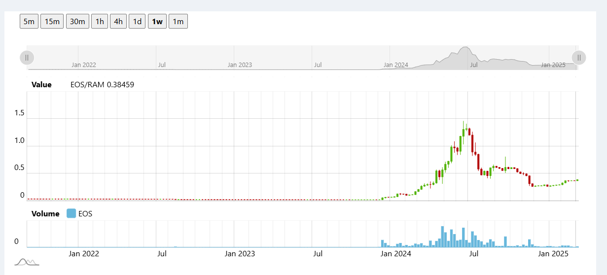 从价格走势来看,RAM的价格走势也比EOS代币稳健的多。