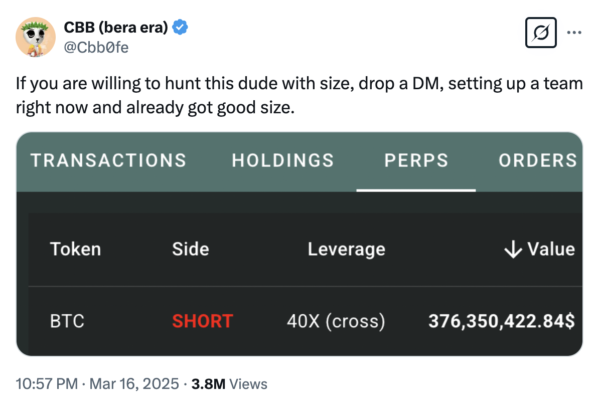 时间来到 3 月 15 日,该「巨鲸」再次以 40 倍杠杆全仓做空比特币。有趣的是,除去一些跟单喝汤成功的散户投资者,它的多次胜利似乎终于引起了一些知名交易者的愤怒,一场针对它的「猎鲸行动」由此声势浩大地展开。