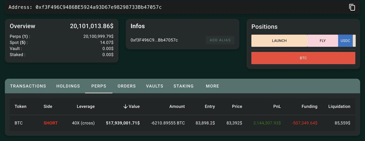 3 月 18 日,近期在加密社区内频频引发热议的「Hyperliquid 50 倍杠杆巨鲸」再次以 40 倍杠杆全仓做空比特币,成功获利 510.1 万美元。Hypurrscan.io 数据显示,该「巨鲸」以 6210.89 枚比特币创下其持仓规模的历史新高,持仓价值约 5.18 亿美元,成本价为 83898.2 美元,清算价为 85559 美元。