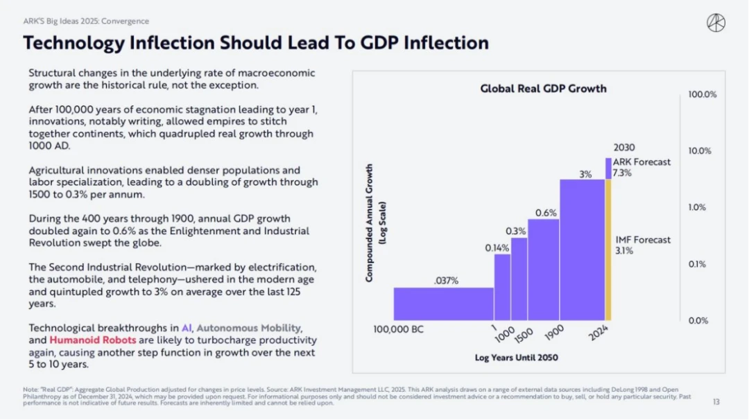 被称为科技投资女王的木头姐 Cathy Wood 在年初发布了 ARK Invest《Big Ideas 2025》研报,表示尽管国际货币基金组织(IMF)预测到 2030 年全球的经济增速为 3.1%,但是她认为,彼时全年的经济增速应该超过 10%!