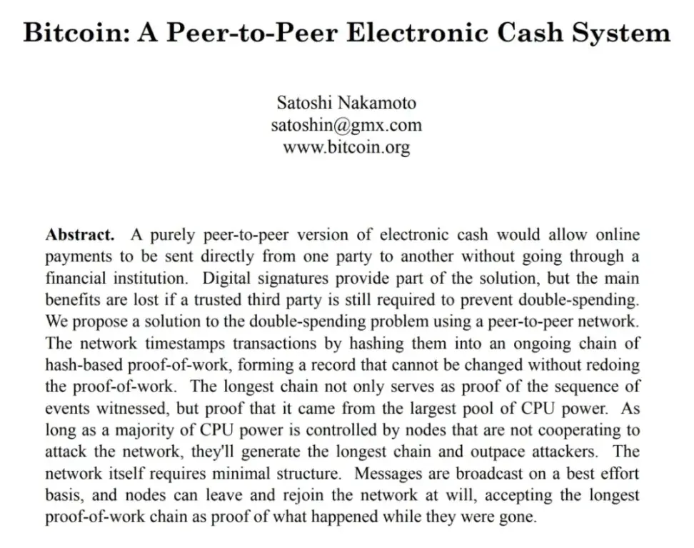 区块链的第一性原理,并非单一技术,而是去中心化、密码学、共识机制、透明性、激励机制等要素的系统性结合。那么这些系统性的结合,在中本聪 2008 年的一纸论文中得到体现: