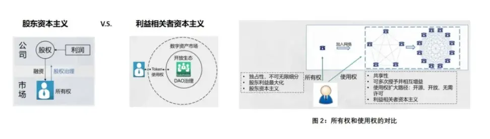 在使用权制度下,去中心化组织中所有参与者以利益相关者的身份进行大规模协作,作出自身的贡献,共享组织价值。在这样的背景下,中心化项目股东所代表的股东所有权已经没有意义,真正有价值的是项目的使用权。