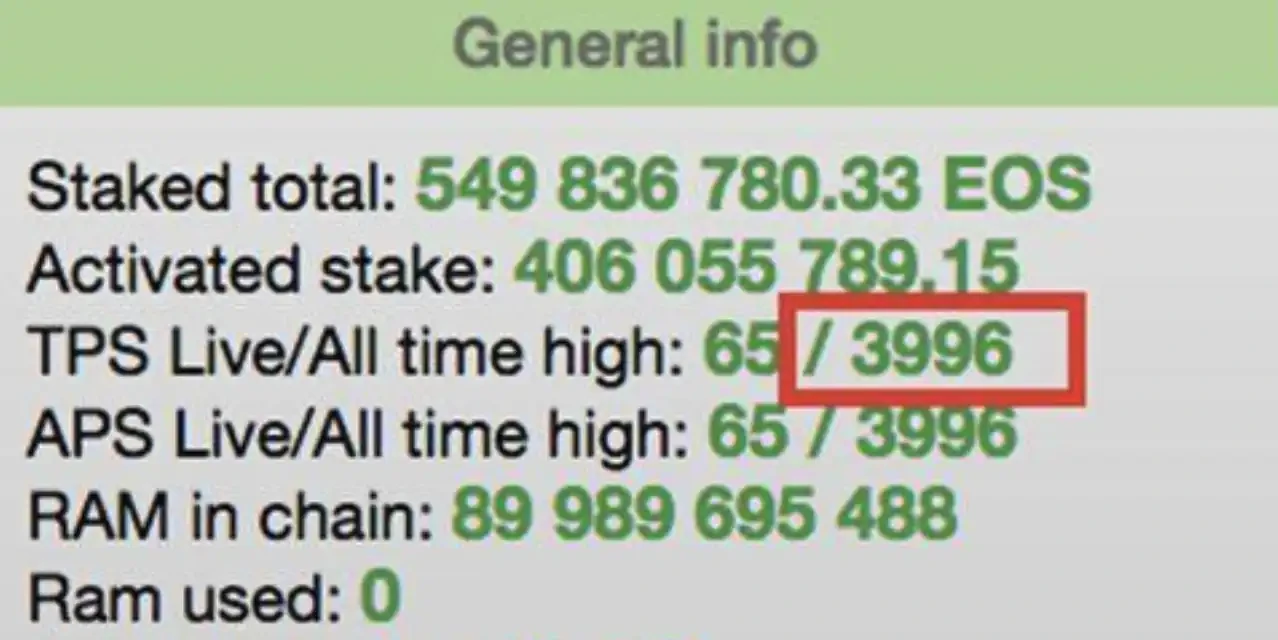 但是,EOS 主链已经启动 4 个月后,最高 TPS 仅为 3996 ,这跟当初宣传的百万相距甚远。