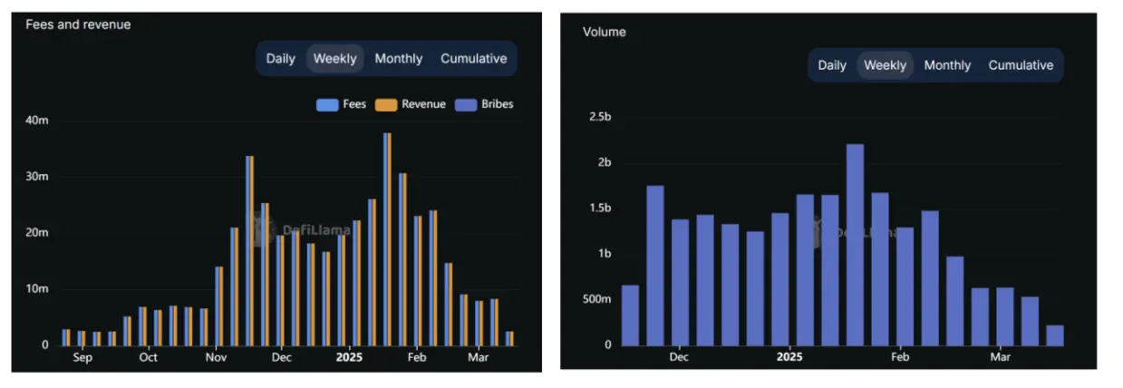 此外,被视为 Solana 生态 Meme 币造富神器的 Pump.fun 单周收入曾飙升至 2792 万美元,但如今已大幅缩水至 800 万美元。周交易量也从 22 亿美元 断崖式下跌至 5.36 亿美元。更值得关注的是,Pump.fun 平台连续多日,24 小时内仅有 1 个代币能突破 100 万美元市值,甚至出现了“交零分卷”的现象。