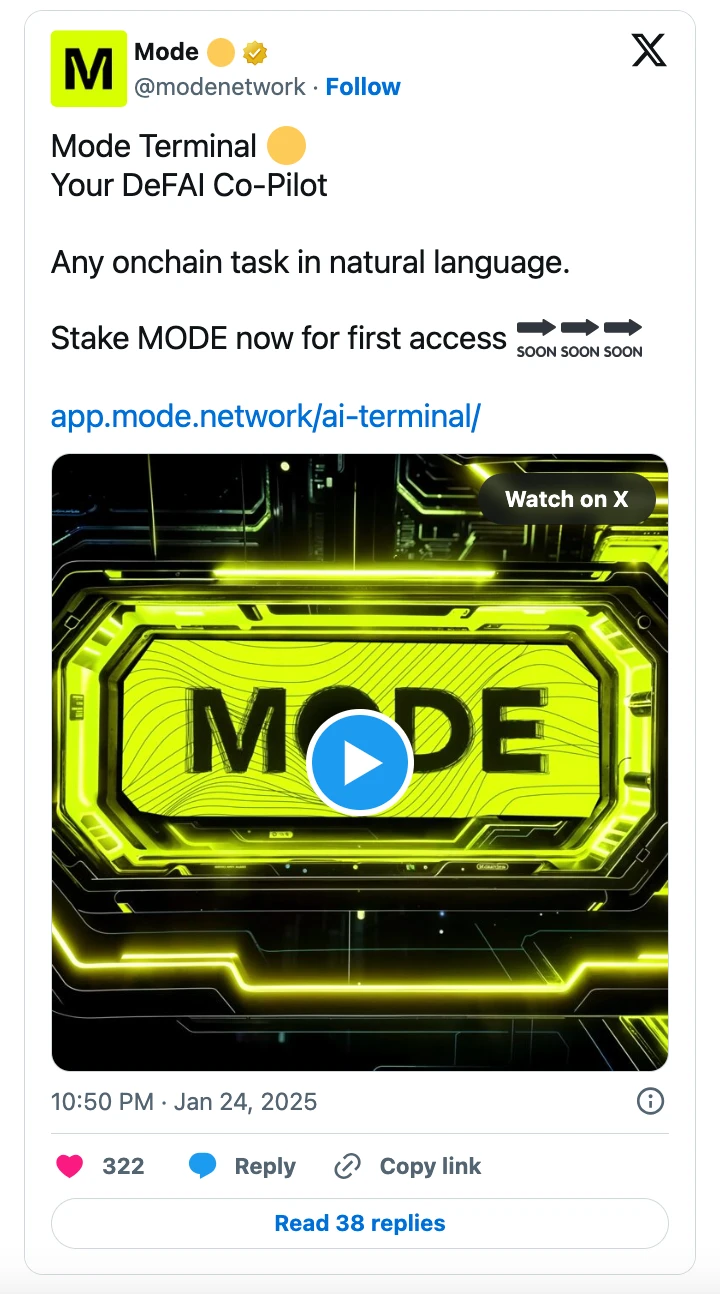 除了为 AI 和代理构建数据层之外,Mode 还将自己定位为为 DeFAI 未来构建全栈的区块链。他们最近部署了 Mode Terminal,这是 DeFAI 的 co-pilot,用于通过用户提示执行链上交易,即将向 $MODE 质押者开放。