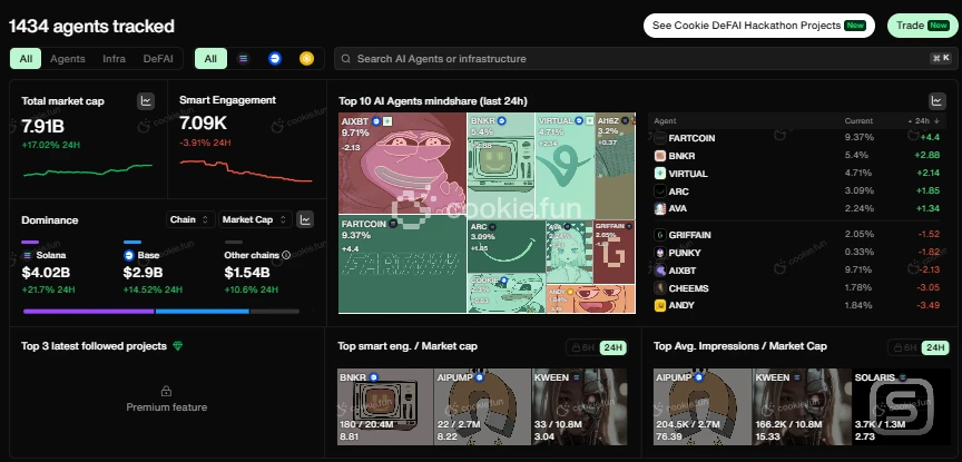 Cookie 为 AI 代理和集群提供模块化数据层,专门用于处理社交数据。它具有一个 AI 代理仪表板,可跟踪链上和社交平台上的顶级代理心智,并且最近为其他 AI 代理推出了即插即用的数据集群 API,以检测 CT 中的流行叙述和心智转变。