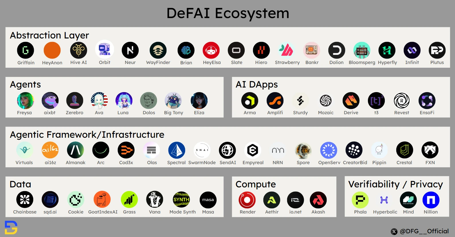 虽然这个生态图还可以进一步扩展,但这些是在 DeFAI 上构建的项目的顶级类别。
