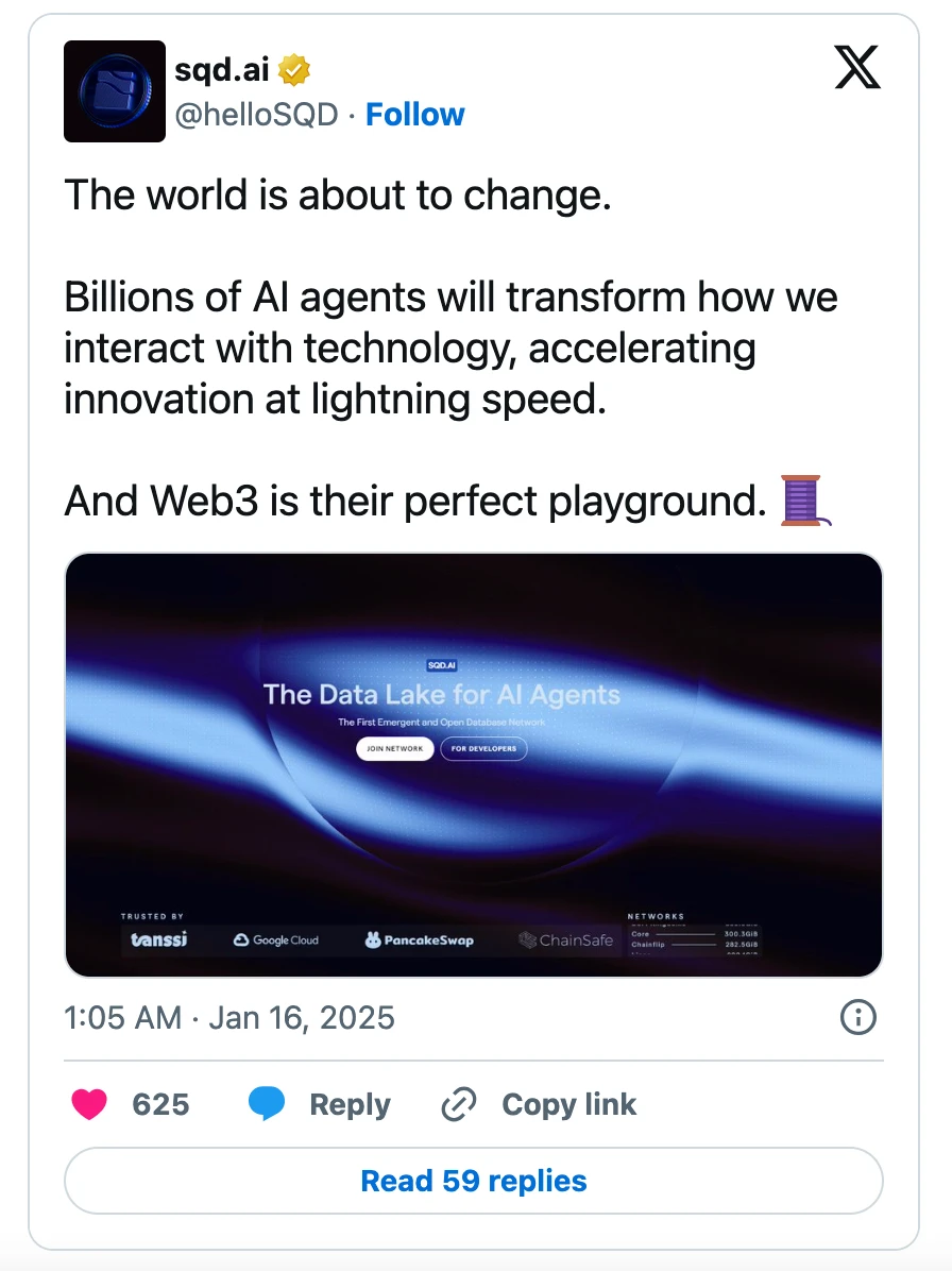sqd.ai (原名 Subsquid)正在开发一个专为 AI 代理和 Web3 服务量身定制的开放数据库网络。他们的去中心化数据湖提供无需许可、经济高效的大量实时和历史区块链数据访问,使 AI 代理能够更有效地运行。