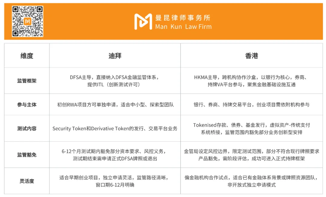 可以看出,迪拜DFSA与香港HKMA虽然都在积极推动代币化监管清晰化,但两地机制在参与门槛与适用主体上呈现出显著差异。