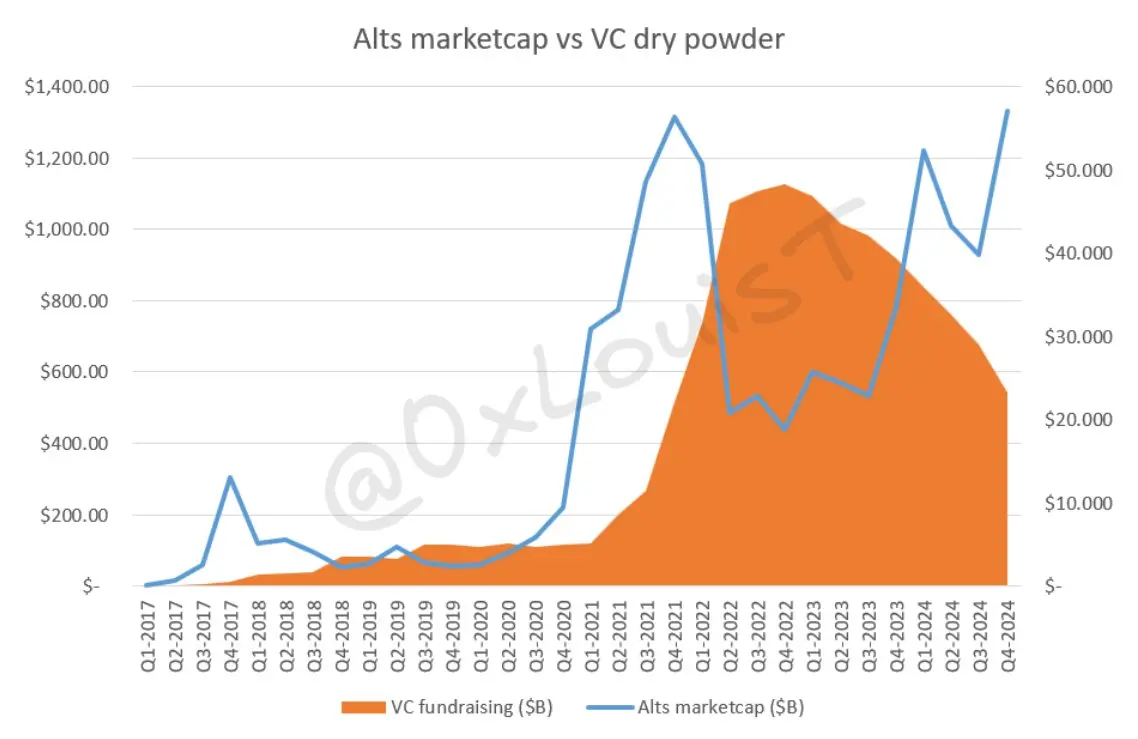 山寨币正在持续失血——为什么?是因为高FDV,还是CEX的上市策略?难道Binance和Coinbase应该直接用TWAP(时间加权平均价格)将其资金投入到新山寨币中? 真正的罪魁祸首并不新鲜——这一切都可以追溯到2021年的加密风投泡沫。