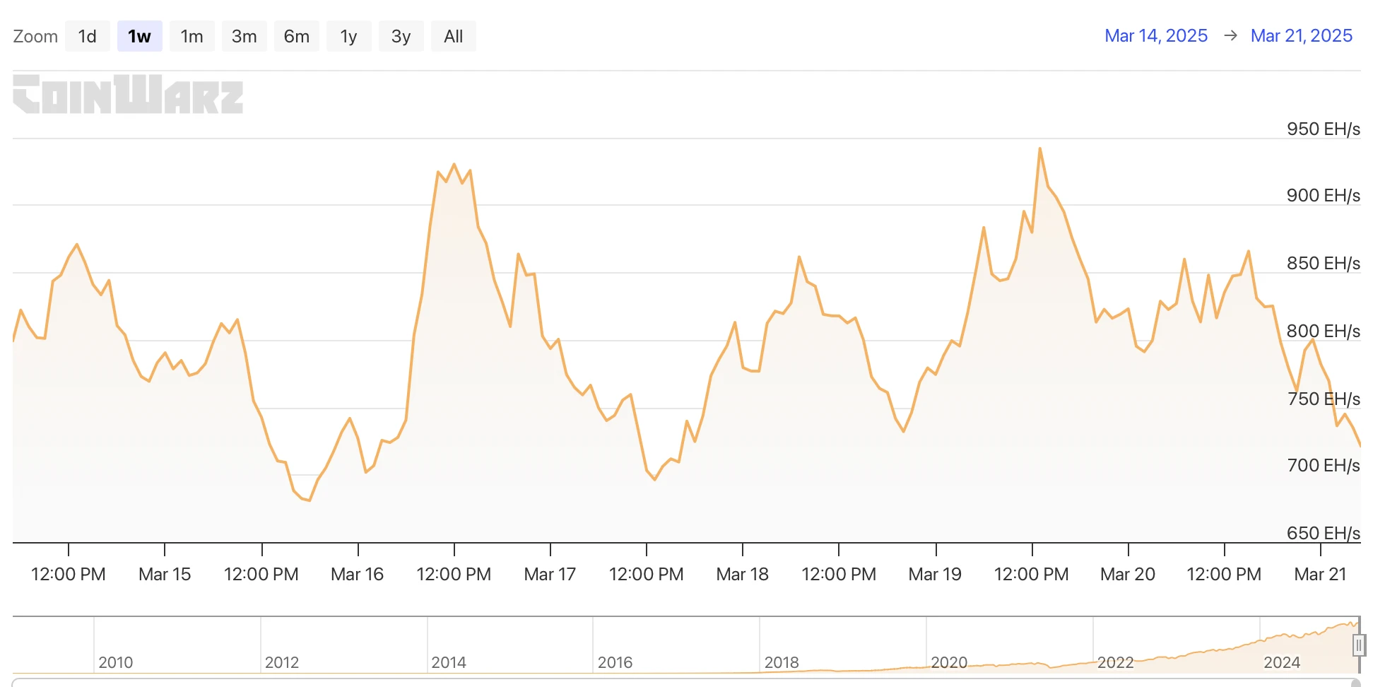 在 2025 年 3 月 15 日至 3 月 21 日期间,比特币网络哈希率呈现波动,具体情况如下: