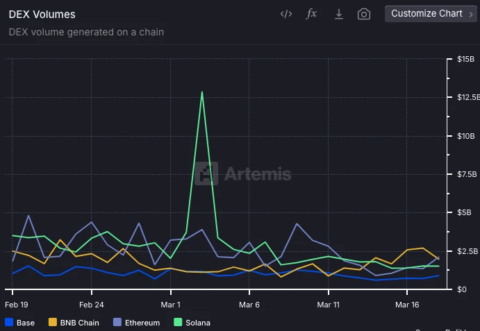先从 DEX 交易量来看,Artemis 数据显示,从 3 月 14 日(Mubarak 爆火初期)至今 BNB Chain DEX 交易量每日都领先于 Solana、以太坊和 Base。