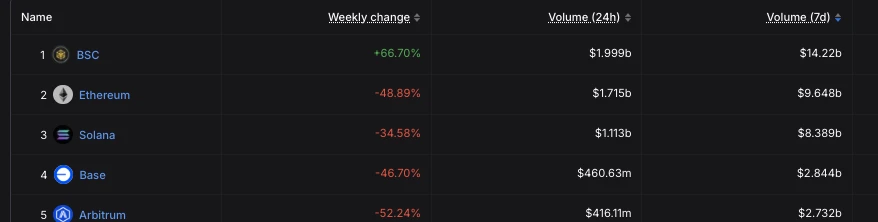 同时根据 DeFiLlama 数据,过去一周 BNB Chain DEX 交易量达 142.2 亿美元,排名区块链第一,而 Solana 则掉到了以太坊之后,位居第三;BNB Chain 主要 DEX PancakeSwap 也成为过去一周交易量最高的 DEX。