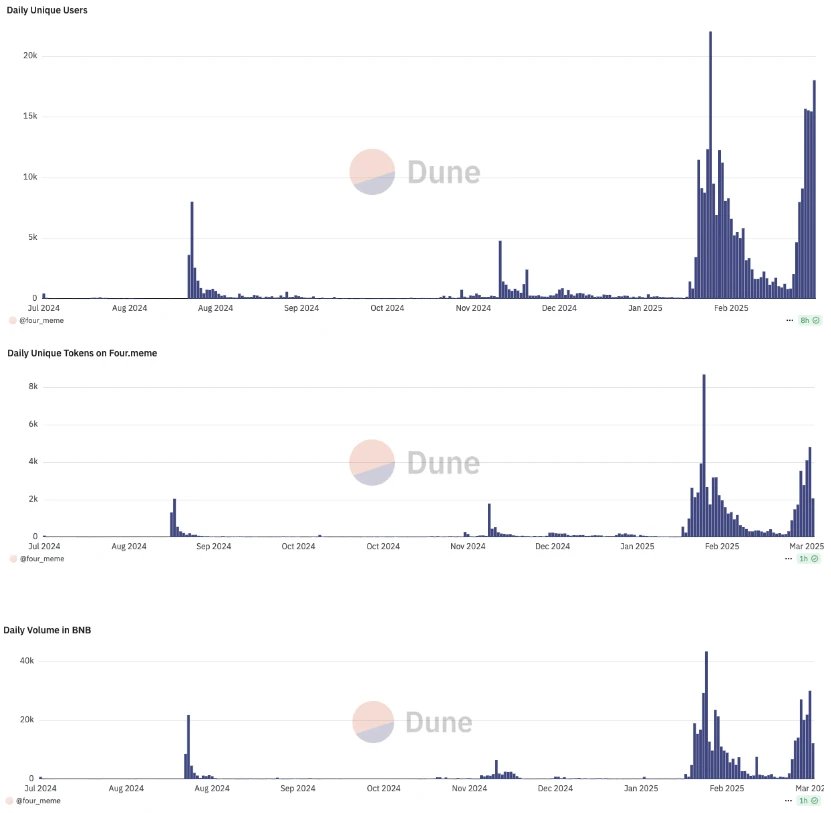 再看 Four.meme 的数据,据 Dune 数据,Four.meme 平台目前总收入超 6266 BNB(约合 400 万美元),据上次统计(3 月 17 日)增长了约 150 万美元。平台每日独立用户数、每日发射代币数及每日交易量在过去一周总体也呈增长态势。