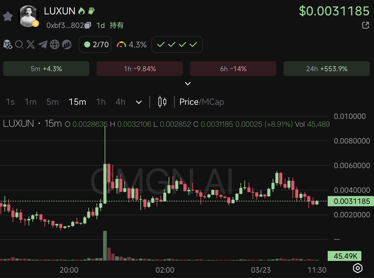 然而,截稿前,$LUXUN 价格已大幅回落至 0.003 美元,回吐 CZ 发推后的涨幅,近 24 小时涨幅缩窄至 545%。