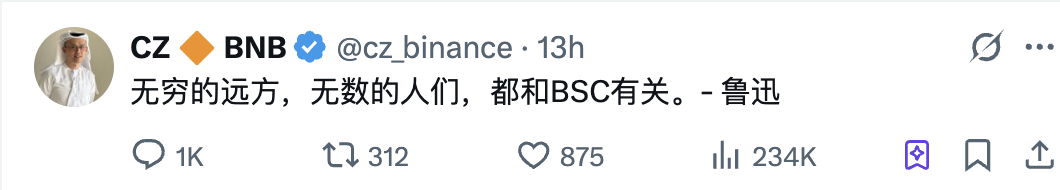 这波热潮甚至吸引 CZ 本人亲自回应。他引用鲁迅的名句「无穷的远方,无数的人们,都和我有关」,改编成「无穷的远方,无数的人们,都和 BSC 有关」,巧妙结合文学与币圈话题,引发网友热议。