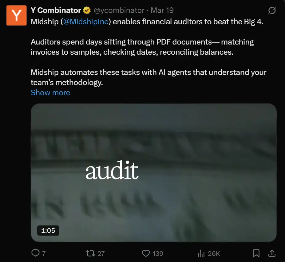 在 Web2 中,展示 AI 和 AI 代理人使用的顶级初创公司最好的平台/分销网络 @ycombinator,特别是在最近的批次中: