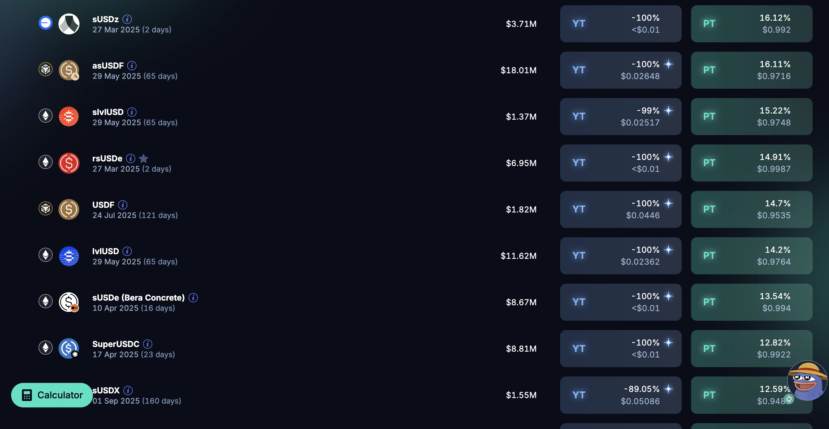可考虑 7 月 31 日到期的 USDe 池(最高 10.83% APY, 60 倍 Ethena 积分增幅)和 5 月 29 日到期的 eUSDe 池(最高 7.59% APY, 50 倍 Ethena 积分增幅和 1.6 倍 Ethreal 积分增幅)