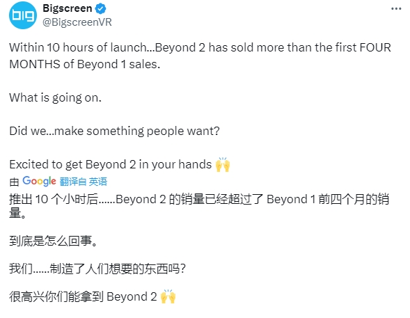 Bigscreen Beyond 2发布10小时,销量超过一代前4个月成绩