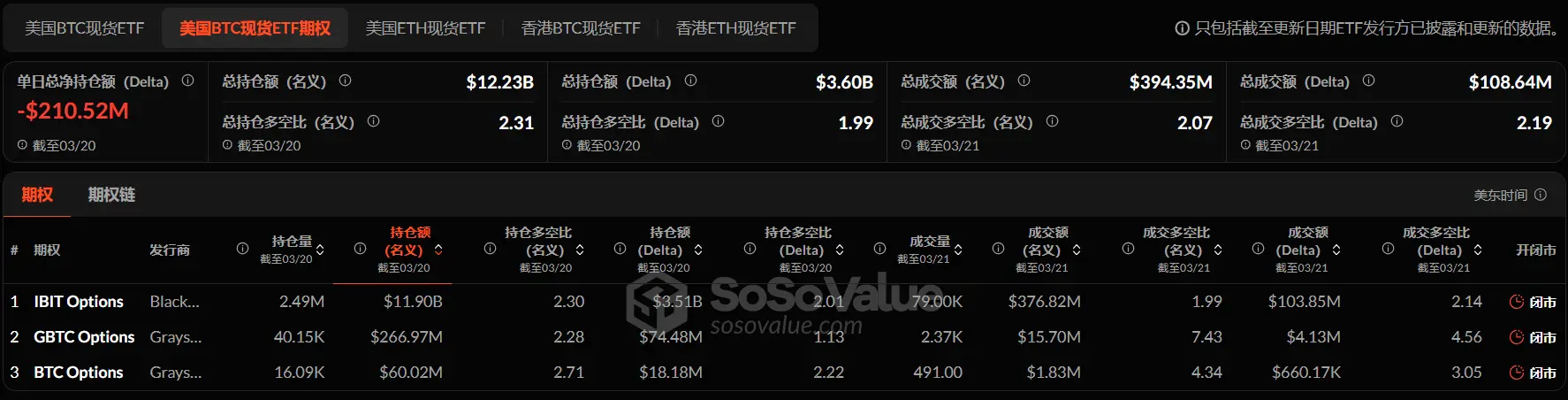 截至 3 月 21 日,美国比特币现货 ETF 期权名义总成交额为 3.94 亿美元,名义总成交多空比为 2.07。