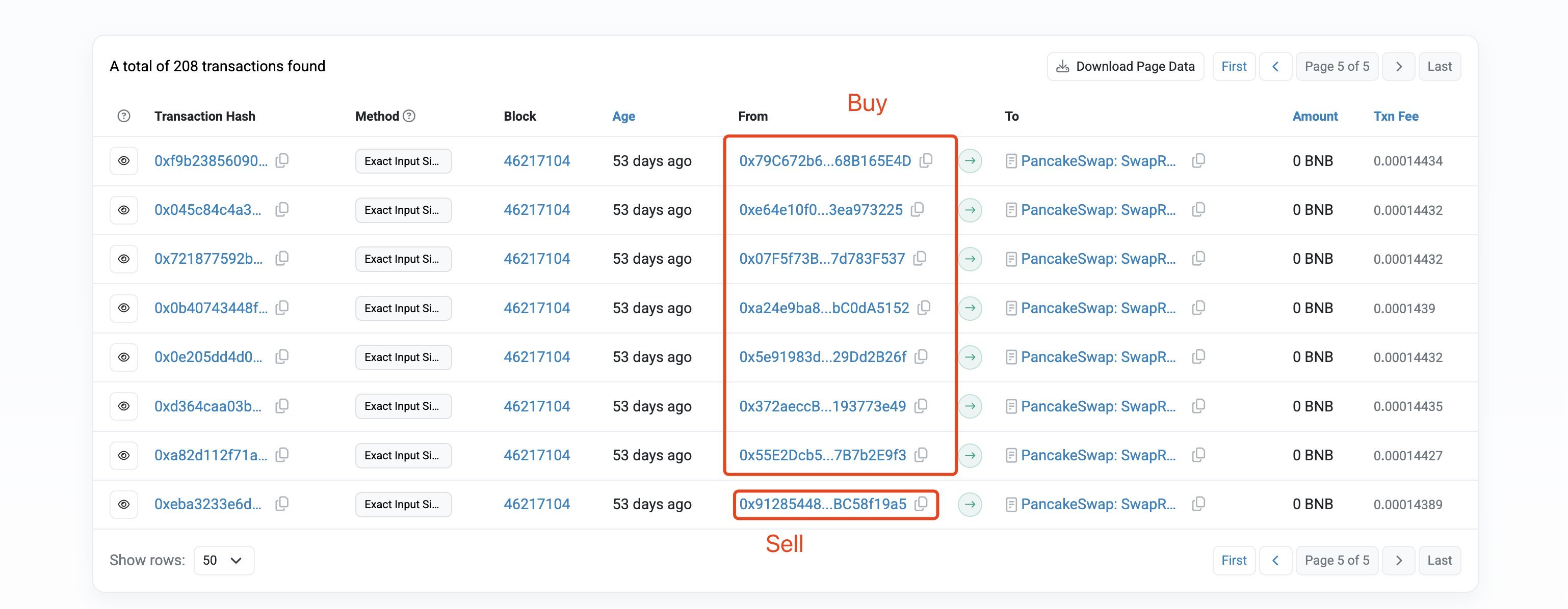 比如这批地址都只主动交易过这一个token,交易时间数量也都在一个范围里,发一组例子: https://bscscan.com/address/0x912854480bfeb8c780e058747509b7dbc58f19a5 https://bscscan.com/address/0x7934a647efe803cf2b5d950c28163766676ee629 https://bscscan.com/address/0x22f02e946bf14718bffdf74ba73bf4672d94bbf7